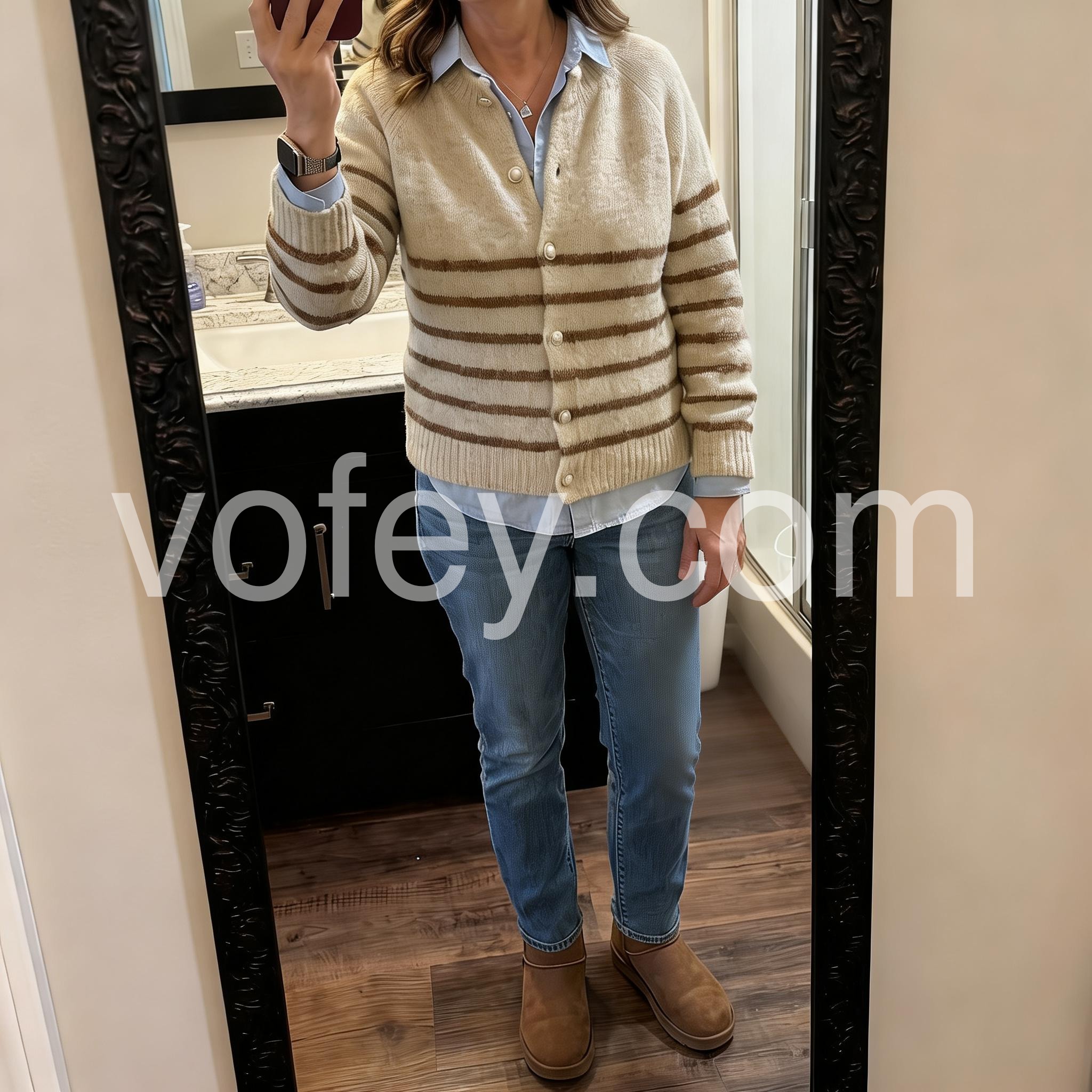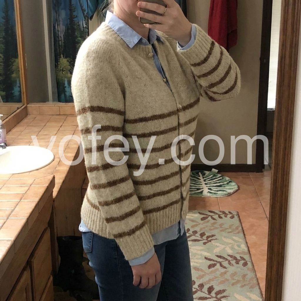 This Apricot Long Sleeve Striped Cardigan is a versatile addition to any wardrobe. Perfect for cooler days, it features a timeless striped design and long sleeves for added warmth. Made from high-quality materials, it's both comfortable and stylish, making it the perfect option for everyday wear. With its classic design and practical features, this cardigan is a must-have for any fashion-forward individual.