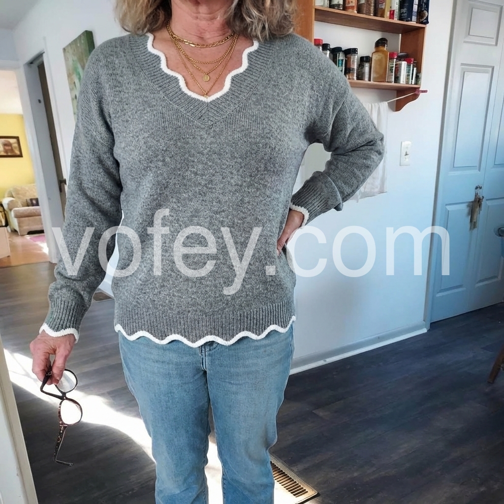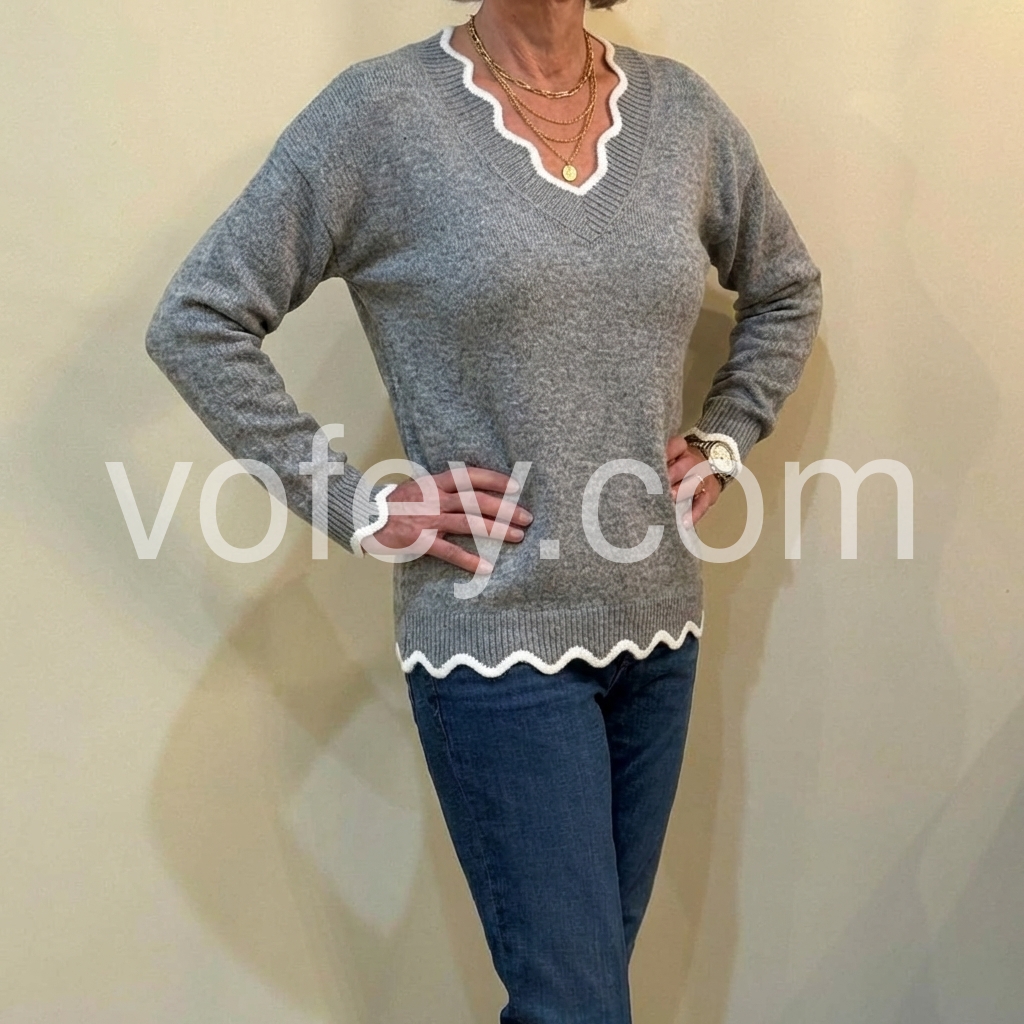 This grey sweater features a soft ribbed texture, combining comfort with subtle sophistication. The delicate white ruffle trim adds a refined, feminine touch, elevating a classic knit into a versatile wardrobe staple that transitions seamlessly from casual to polished looks. Ideal for layering or wearing alone, it offers both warmth and style with an expert-crafted design.