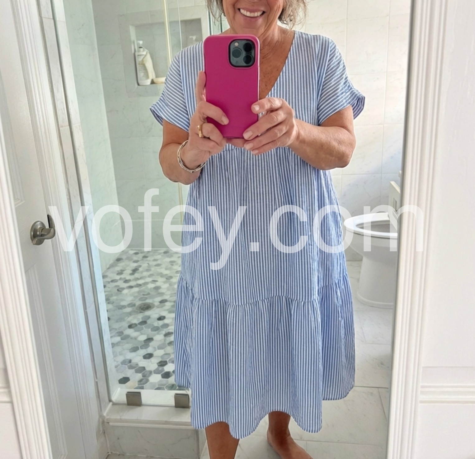 This Youthful Striped Print V-Neck Midi Dress is designed for the modern fashion-forward woman. Made with a flattering V-neckline and eye-catching striped print, this dress is versatile and perfect for any occasion. Its midi length adds a touch of elegance, while the youthful design adds a playful touch. Elevate your wardrobe with this must-have dress.