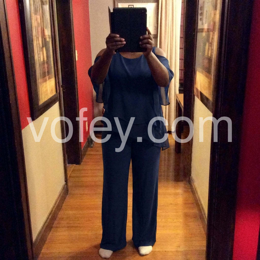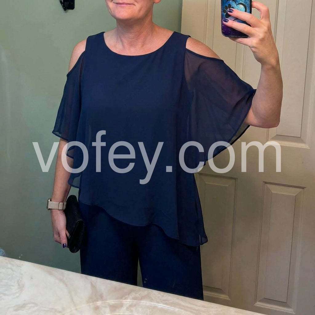 This fashionable two-piece set includes a navy cold shoulder three-quarter length draped sleeves and asymmetrically layered ruffled top and pants. Crafted from lightweight and soft materials, this set is perfect for any occasion. Step up your look with this stylish set.