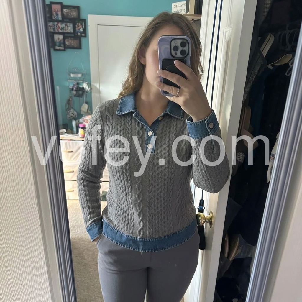 Grey Denim Collar Cable Long Sleeve Sweater