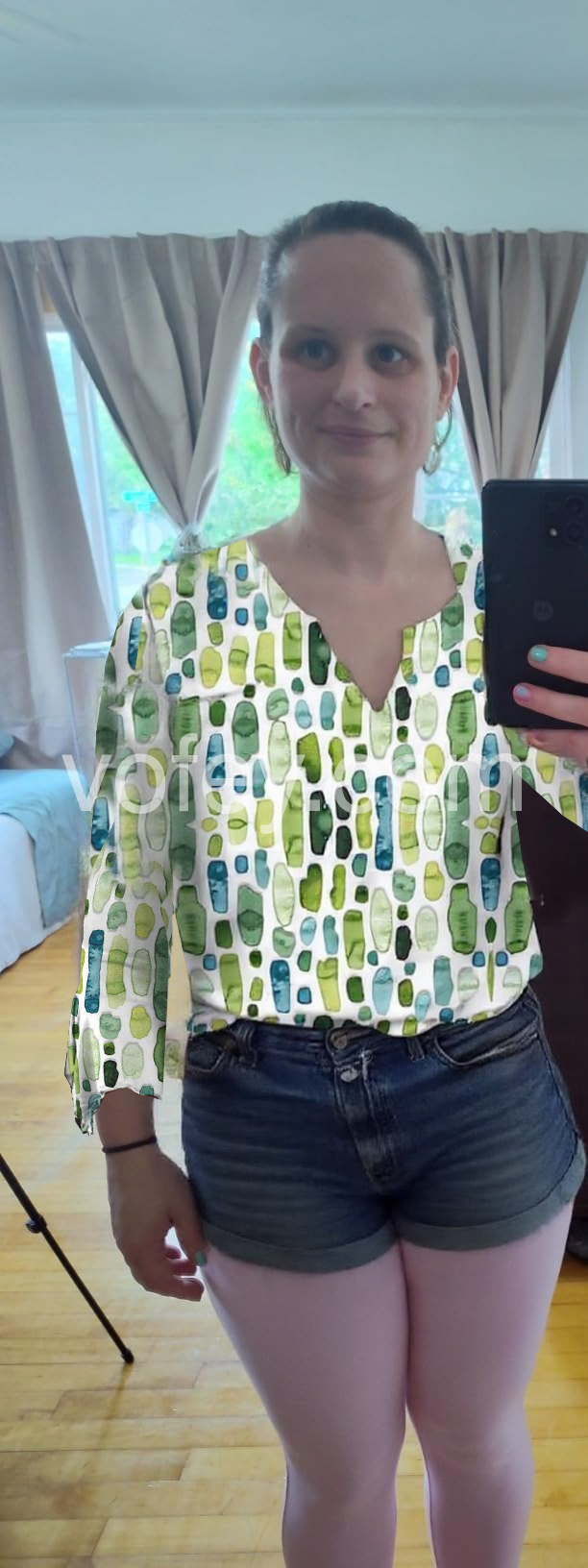 Green Geometric Watercolor Print Notched ¾ Sleeve Top